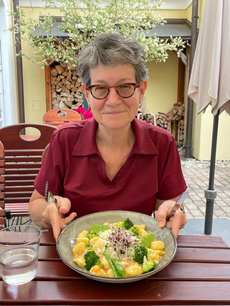 I lunched on gnocchi and fresh veggies, and of course salmon for dinner, no fish-photo taken. A glass of wine is $3 or less here and the dollar is strong, so other than gasoline, things have been inexpensive so far. Our trip to the grocery store for lunch was a bargain.